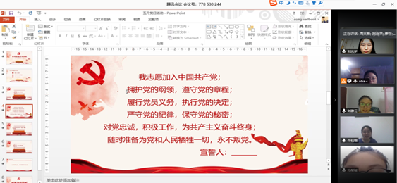 活动伊始,支部全体成员一起宣读入党誓词,支部成员虽身处五湖四海,但重温入党誓词让成员们的精神力量凝聚在一起,成员们用铿锵有力的声音表达了拥护中国共产党的坚定信念。