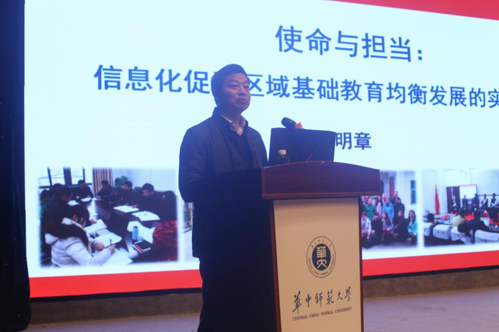 而后,副院长左明章教授作了《使命与担当;信息化促进区域基础教育均衡与创新发展实践》的专题报告。在报告中,他分享了前往四川省大凉山阿土勒尔悬崖村小学的调研经历,介绍我校已将“悬崖村”小学作为以教育信息化促进教育精准扶贫研究实验校,为大山里的孩子们建起信息化天梯的成果。此外,还介绍了湖北省信息化与基础教育均衡发展协同创新中心、信息化推进区域基础教育均衡发展的实践内容、发展模式、机制创新及相关项目的具体内容。