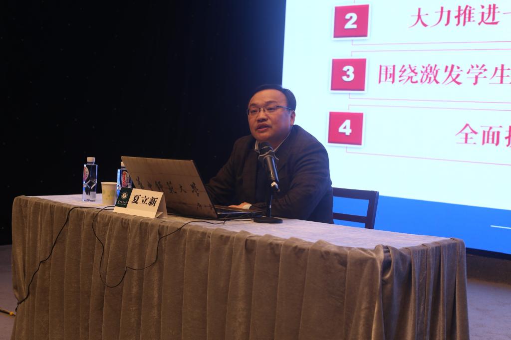 在此次理论学习活动中,夏立新副校长作了题为《全面落实立德树人根本任务 以人才培养质量提升推动一流大学建设》的专题报告。报告首先以学习领会习近平总书记关于教育工作的系列重要讲话精神开始,他指出教育工作者要深刻把握全国教育大会的重要历史意义,准确领会习近平总书记关于教育改革的“九个坚持”,学深悟透全国教育大会精神要把握 “六新”。他强调,要全面把握人才培养这一高等教育内涵式发展的关键环节。在新时代本科教育工作会议的召开这一背景下,要以“以人为本,四个回归”为原则,以新时代高教40条为思路,以实施一组领跑计划为路径,达到全面把握人才培养的目的。最后,他提出要乘势而上大力推进人才培养质量提升,强调教育工作者要深刻把握新时代人才培养形势变化,结合学院人才培养现状应对处理三个关键性问题。夏立新介绍了我校近年来在人才培养改革方面的探索和实践,最后还就提升人才培养质量提出了几点建议:一是三博文化促进全面发展,二是课程思政落实全员育人,三是课程改革打造高端金课,四是实践教学构建长效机制,五是立德树人强化教师教育,六是科教融合推动创新创业。