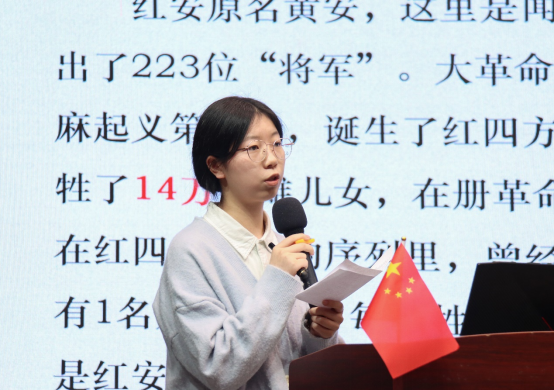 随着各组选手按作品大类依次进行展示及现场答辩,比赛进入高潮。选手们结合主题,以独特的视角,为在场师生们带来有新意、有思想的优秀作品。其中微视频类作品《无名风骨 红之底色》采用人物访谈式纪录片的风格,从守墓人姜能山出发,用几名无名烈士的故事引出承托红安精神底色的十余万名无名英雄的形象。平面设计类作品《人工智能元宇宙畅想》以推动人工智能教育的普及为目的,设置了卡牌这一低成本载体。从六张总领卡牌的设计到对衍生品的设想均结合人工智能的特点,兼具娱乐性与教育性。现场三位评委们对这些作品进行了专业细致的点评,并就参赛选手作品的进一步优化改进提出了相关指导建议。