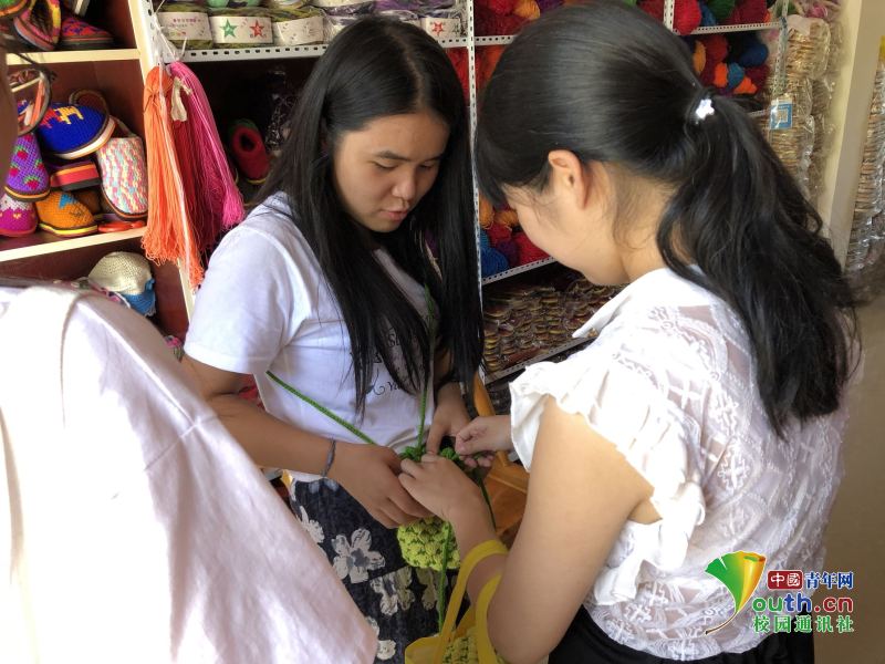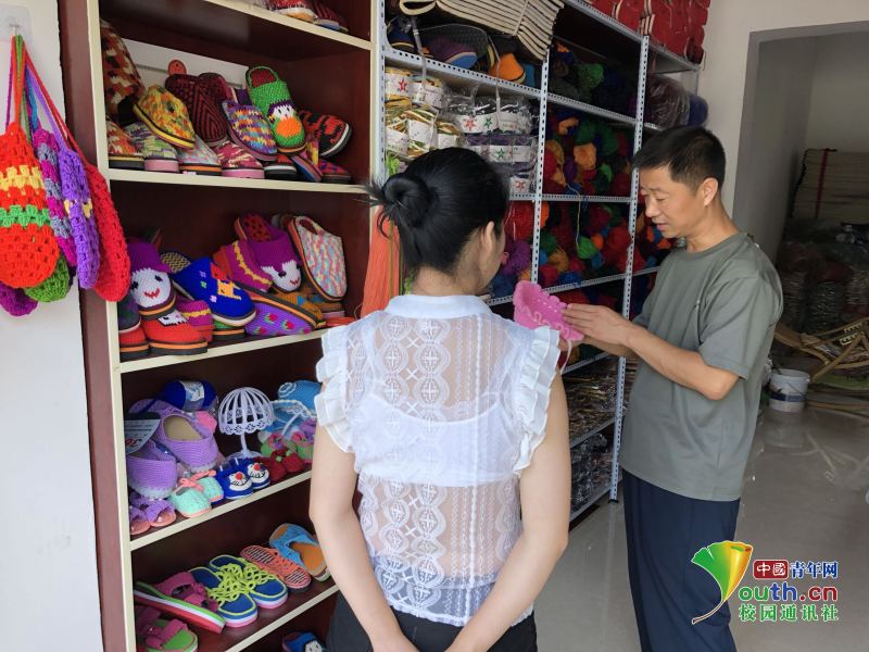 图为李丹丹正在给客人推荐她做的一款帽子。中国青年网通讯员陈亮
