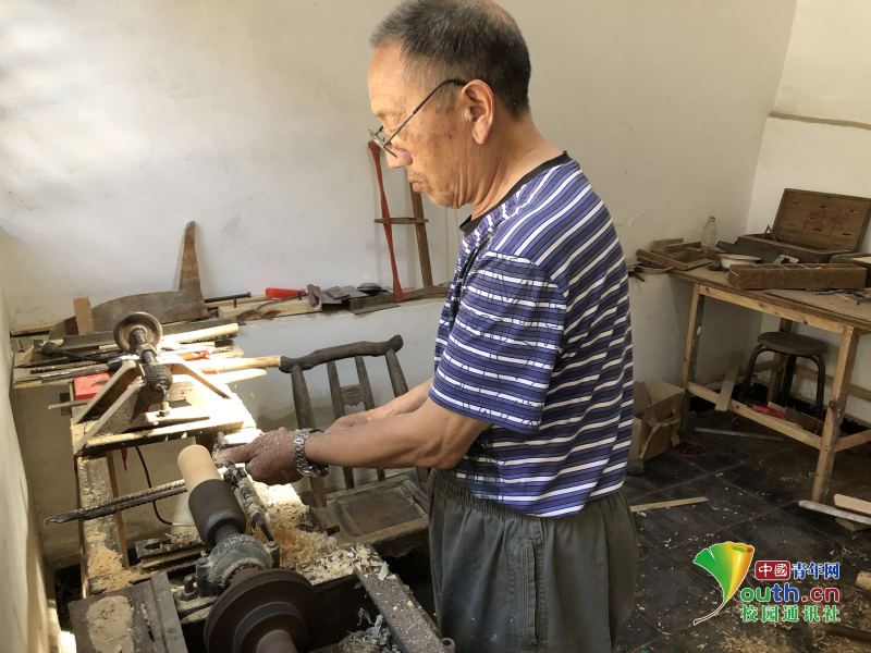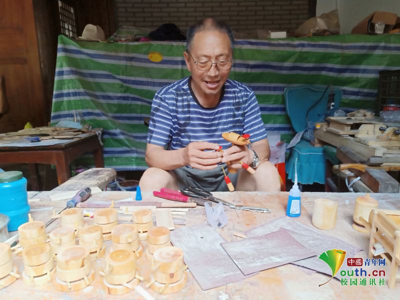 图为王良伦正在修复他制作的“帆船”。中国青年网通讯员陈亮摄