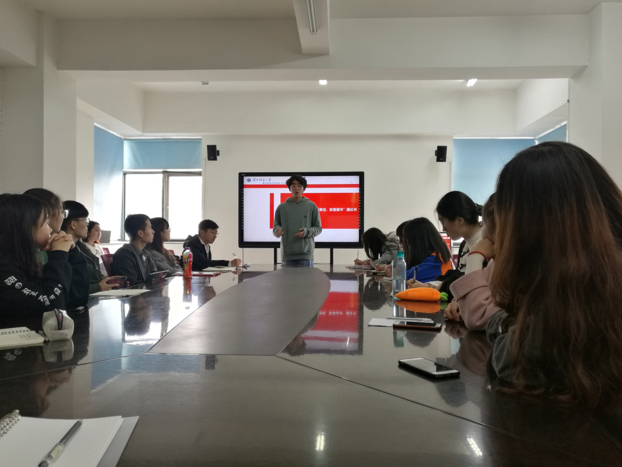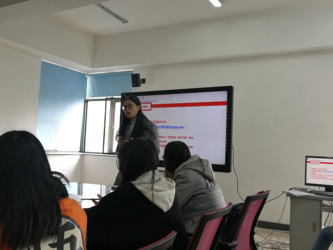 随后,宋佳欣发布了十一月团日活动主题:切实深入学习“胸怀责任,发奋读书”倡议书、“青年大学习”网上团课学习第二季及青年知识竞答。宋佳欣要求在场的每位团支书,要落实各支部每位同学认真学习倡议书的活动,同时鼓励各支部成员主动了解时政知识,关心国家大事。