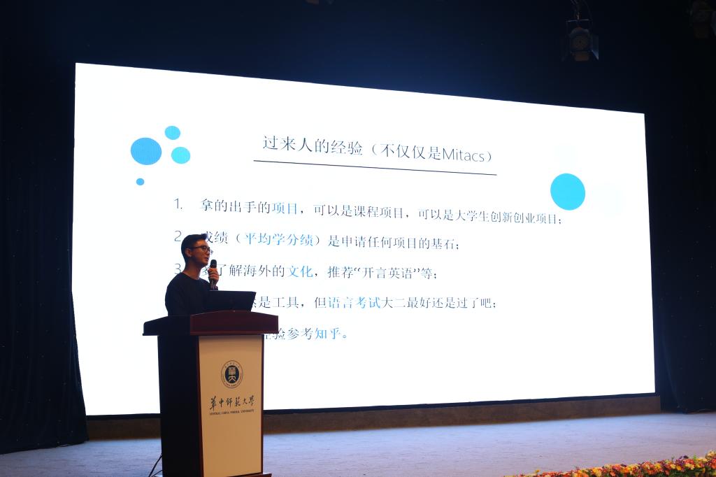 首先,由陈清泓分享参与CSC加拿大Mitacs本科生实习项目的经历,他为大家介绍了出国留学的城市—蒙特利尔,分享了与朋友游玩的照片,同时介绍出国留学方式,其中重点介绍了Mitacs 实习的相关内容,在问答环节中,在场学生积极提问,就学分绩要求,科研项目等方面进行交流。