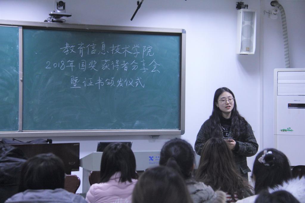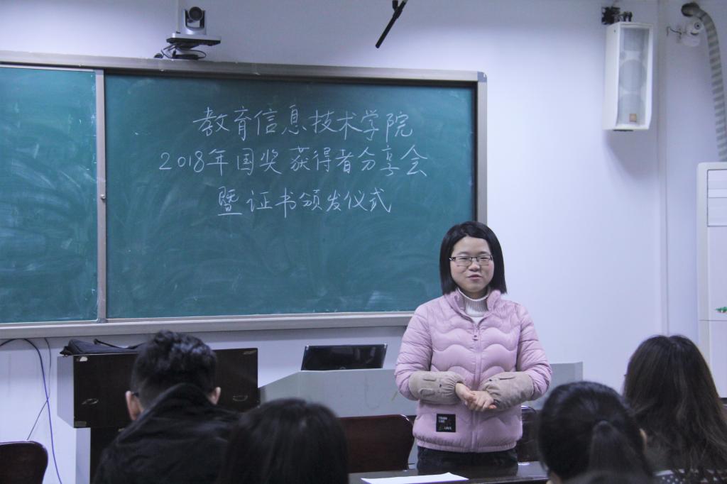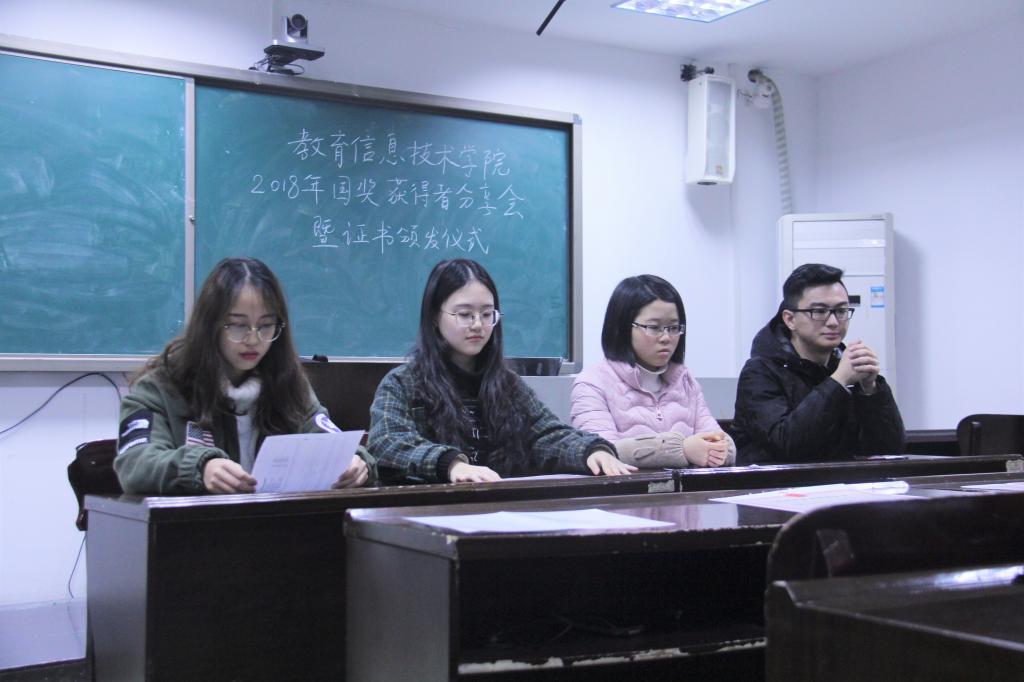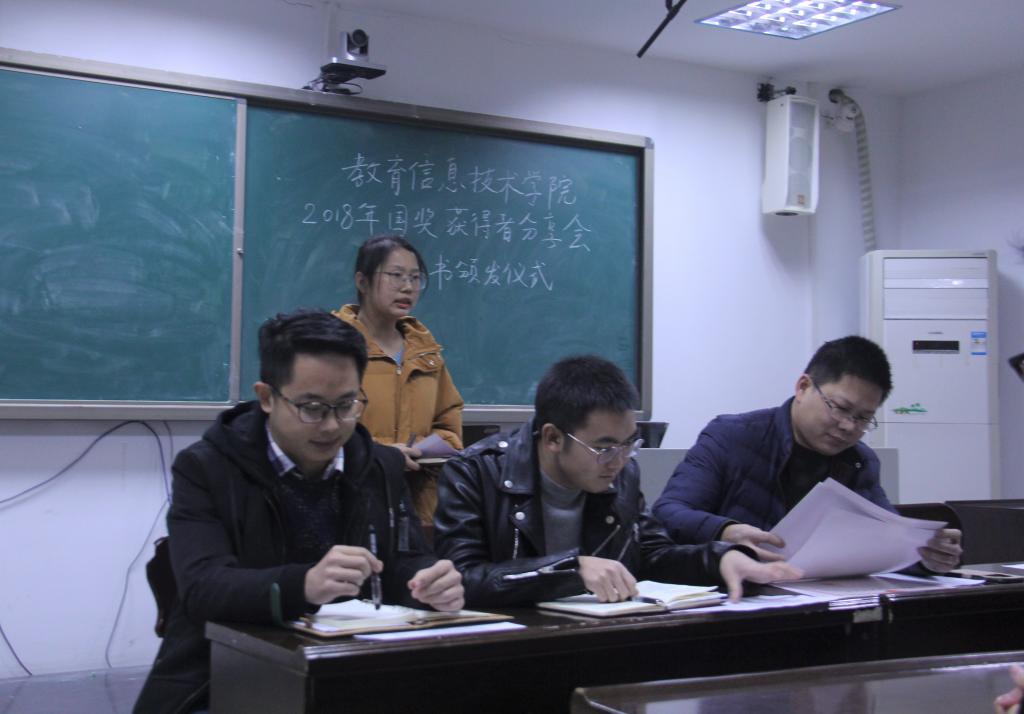 教育信息技术学院讯(见习记者 胡容鸣)为进一步提高我院学生学习积极性,充分发挥国家奖学金获得者优秀榜样力量,12月14日下午,我院在九号教学楼638教室举行国家奖学金获得者交流分享会。院党委副书记钟文锐出席活动,院团委副书记兼2017级辅导员陈亮、2016级辅导员尤志兵、2015级辅导员冯远航及2018级部分本科生参加活动,本次活动邀请本科生2015级陈清泓、边佳琪,2016级刘昕,2017级王蕊参加交流分享。