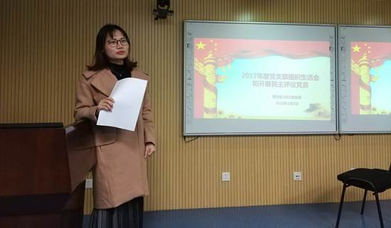 然后,罗卓然同志就2017年支部的主要工作情况做简单汇报,并从新党章规定的党员的八项基本义务出发,鼓励各支部成员结合实际情况及不足之处开展批评与自我批评。大家踊跃发言,分别从“懒惰享受的不良习惯”、“做事风火,不够沉稳”、“自控力不足,拖延症严重”、“忽略与父母之间的交流”和“党性不足,没有很好地起到带头模范的作用”等多个方面严肃地进行了批评与自我批评。在这之后,通过无记名投票的方式在党支部中开展了民主评议。