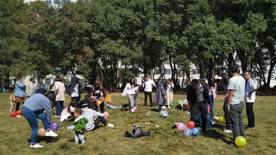 随后,班级进行了技巧和体力结合的游戏——踩气球。全班同学都参与游戏,首先每人脚腕处绑上气球,然后保护自己的气球不被踩破的同时努力踩破别人的气球。 在一轮一轮的博弈中,大家身心得到了放松,也使得大家更加熟络。至此,班级见面会也告一段落。