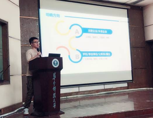 此次交流分享会由团总支副书记罗磊主持,共邀请了五位即将毕业并已顺利签约知名单位的师兄师姐分别进行经验分享,他们分别是教育技术学学术型硕士陈敏师兄(百度,前端工程师)、教育技术学学术型硕士杨婷婷师姐(佐治亚大学,博士研究生)、现代教育技术专业型硕士杨悦师姐(扬州大学,信息化建设与管理中心)、数字媒体技术学术型硕士王学璠师姐(光谷第六小学信息技术教师)、数字媒体技术学术型硕士张玉麒师兄(小米,MIUI产品经理)。