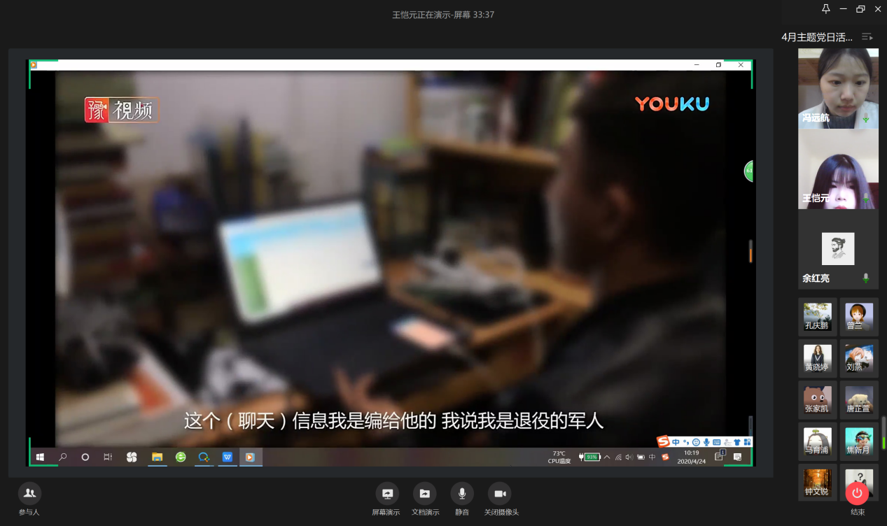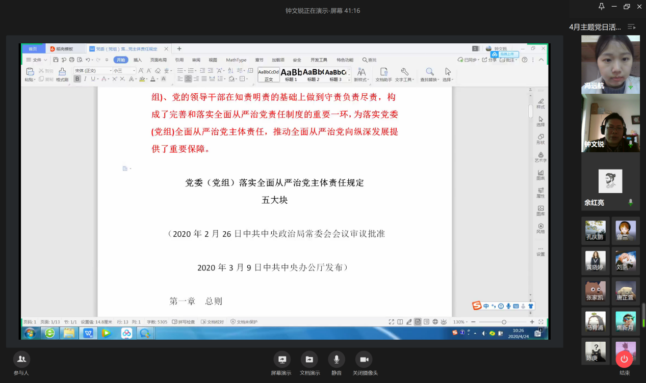 2020年4月24日上午10点,我院本科生党支部和行政党支部联合开展线上主题党日活动,学习讨论习近平总书记关于总体国家安全观的重要论述精神、习近平总书记关于统筹抓好疫情防控和经济社会发展的重要讲话精神、中共中央办公厅印发的《党委(党组)落实全面从严治党主体责任规定》等精神和文件。活动由本科生党支部书记冯远航主持,院党委副书记、行政党支部书记钟文锐出席会议,院党委书记游丽以普通党员身份参加学习,行政党支部、本科生党支部全体党员参加。