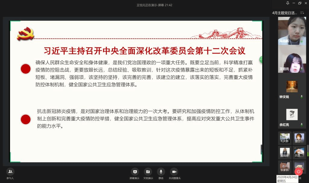 首先,本科支部的王恺元同志带领大家一起学习了习近平总书记在中央全面深化改革委员会第十二次会议的重要讲话内容,讲话内容强调要完善重大疫情防控体制机制,健全国家公共卫生应急管理体系,并把生物安全纳入了国家安全体系。